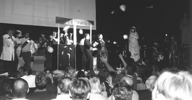 (Everyone else on stage has been swelling the ranks of the MINGLING CROWD as the following happens: The two vending stands are pushed together, forming a single sing at the top that says "FISHBRAINS." The NOBEL LAUREATES, with the happy approval of the MINGLING CUSTOMERS, fling fishbrains into the audience.)