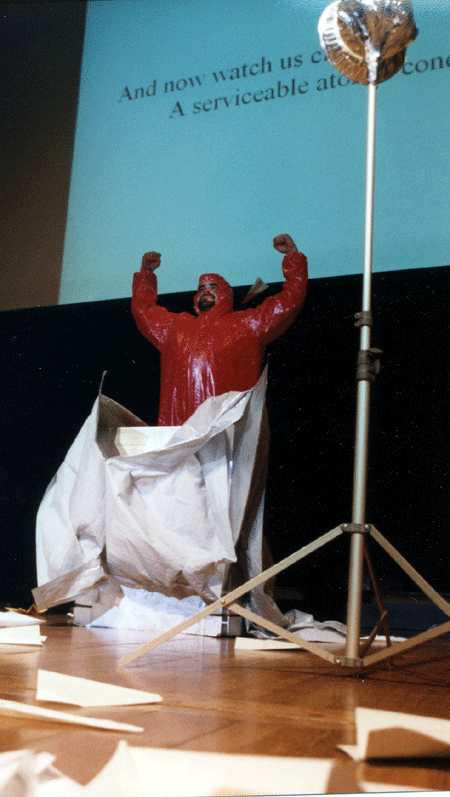 Little Atom suddenly becomes a Bose-Einstein condensate. The tall metal object is meant to represent a laser apparatus. Photo: David Holzman. |