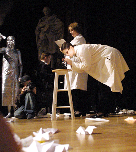 Tara Hunt, as Eve’s colleague, peers into a microscope to see if she can see what Margot Button, as the Scientist Eve, has been making such a fuss about. Photo: Margaret Hart. |