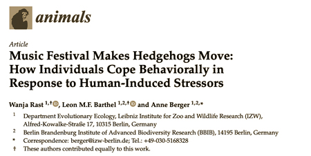 “We remotely observed eight hedgehogs in a Berlin city park before and during a music festival using measuring devices attached to their bodies. While the actual festival only lasted two days (with about 70,000 visitors each day), setting the area up and removing the stages and stalls took 17 days in total. Construction work continued around the clock, causing an increase in light, noise and human presence throughout the night. In response, the hedgehogs showed clear changes in their behavior in comparison to the 19-day period just before the festival. We found, however, that different individuals responded differently to these changes in their environment. This individuality and behavioral flexibility could be one reason why hedgehogs are able to live in big cities.”