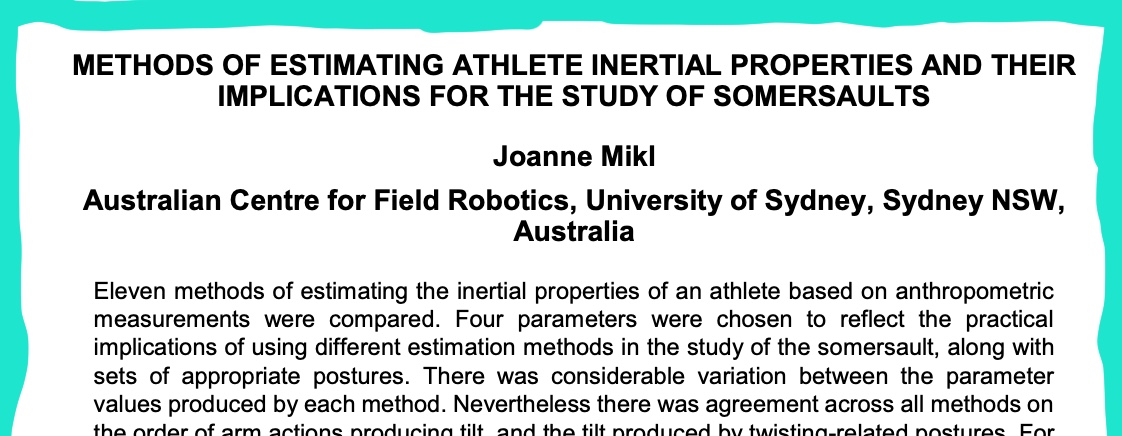 There are many twists in the story of how Joanne Mikl estimated the inertial properties of athletes who do somersaults. Mikl explains some of them, in this study: