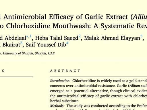 The question for dental professionals looms perhaps large: should they urge patients to use garlic as a mouthwash? This review study tries to find an answer to that question: “The Clinical Antimicrobial Efficacy of Garlic Extract (Allium Sativum) Compared to Chlorhexidine Mouthwash: A Systematic Review,” Youmna Ahmed Abdelaal, Heba Talal Saeed, Malak Ahmad Elayyan, Sara […]