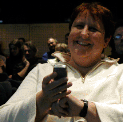 This is one of the two audience members who volunteered -- and resolutely carried acted -- to keep the speeches to a manageable duration. To accomplish this, they used a wristwatch and two mobile phones. |