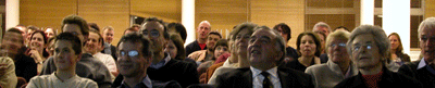 The Manchester audience studies a projected image of a man raptly attending a lecture. |
