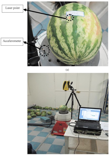 “The identification of watermelon ripeness from its appearance such as size or skin colour is very difficult. The common subjective method is usually based on the sound produced by a slap. This method is prone to human factor errors; it may be a good way only for people with much experience. This idea led researchers to study acoustic methods…. The main objective of the present work is to study the potential of laser Doppler vibrometery and vibration spectra for evaluation of watermelon firmness….